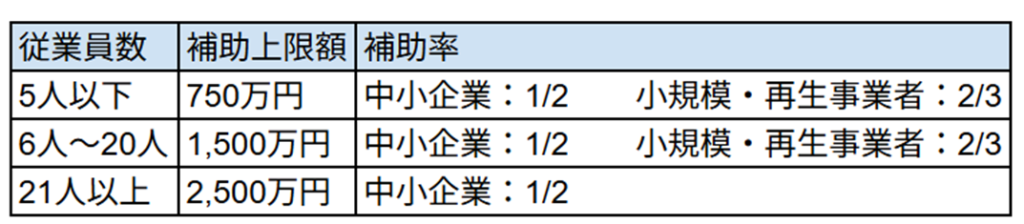 補助上限額は、常勤従業員の人数に応じて変動します。補助率は、事業者の規模によって異なります。
