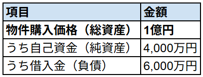 購入直後のバランスシートは、資産1億円に対して、純資産4,000万円、負債6,000万円という構成になります。