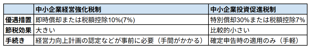 中小企業経営強化税制と、中小企業投資促進税制の最大の違いは、その「優遇の大きさ」と「手続きの手間」にあります。