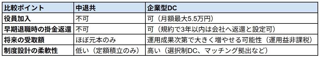 役員自身も加入でき、問題のある早期退職者への資金流出を防ぐ「セーフティネット」を設けられる点で、企業型DCは、より現代の雇用環境に適した制度と言えます。ただし、導入・運営に手数料がかかる点や、従業員自身に運用責任が生じる点がデメリットとして挙げられます。