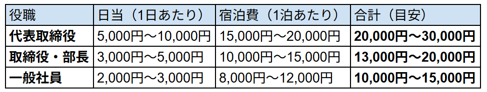 - 社長・役員クラス:日当+宿泊費で1泊あたり2万5千円~3万円程度