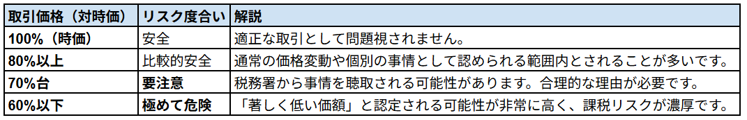 そのため、時価の80%程度であれば、通常の経済取引の範囲内(許容範囲)として認められる可能性が高いと考えられています。