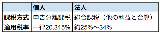 単純な税率だけを比較すると、法人の方が、個人よりも高い税率が適用されることになります。もちろん、法人の場合は、損益通算や経費計上の範囲が広いといったメリットがあるため、一概にどちらが不利とは言えませんが、この基本的な税率の違いは、必ず認識しておく必要があります。
